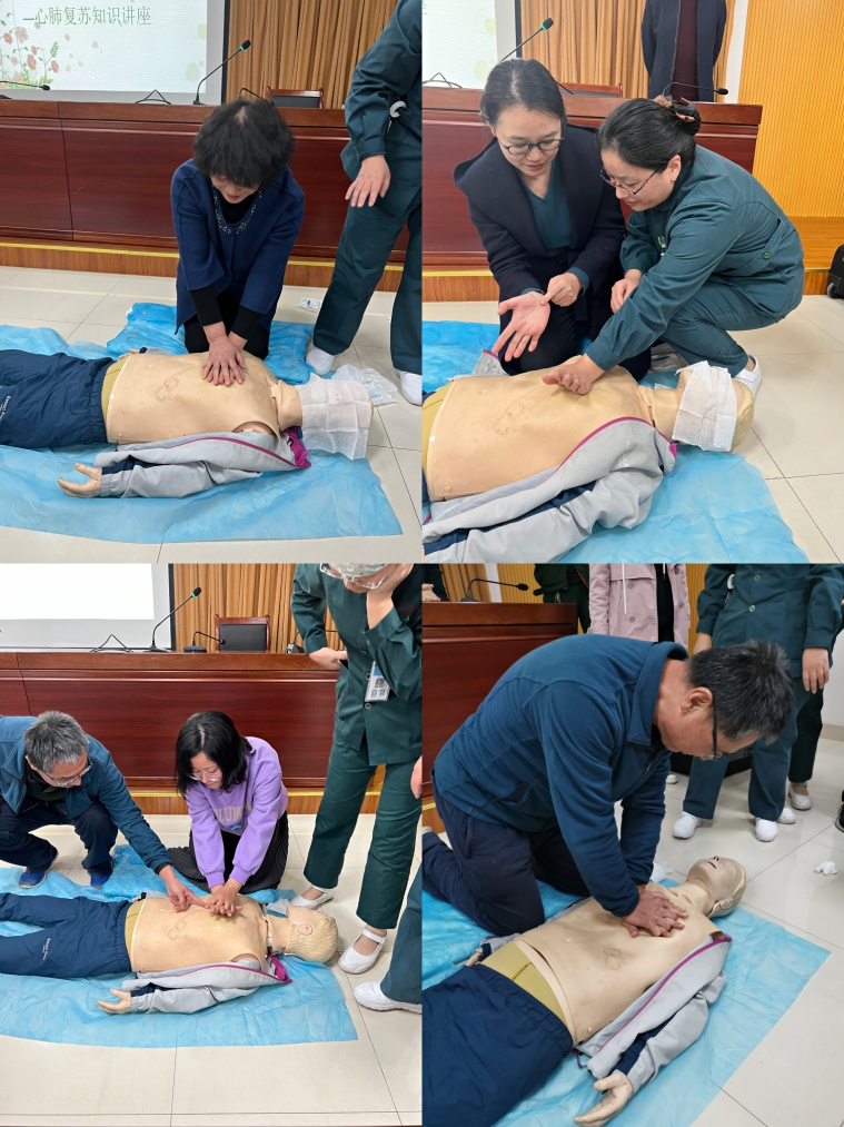 讲座分为理论讲授、现场演示及实践操作三部分内容。王青主任通过题目讲解、实物展示、现场演示等形式,为老师们详细讲述急救相关的理论知识,结合近年来发生在身边的案例,向老师们强调了应急救护“黄金四分钟”的重要性。并逐一讲解胸外按压、人工呼吸、海姆立克急救法等抢救操作方法,全面展示了心肺复苏和气道异物梗塞突发事故的现场救助流程。