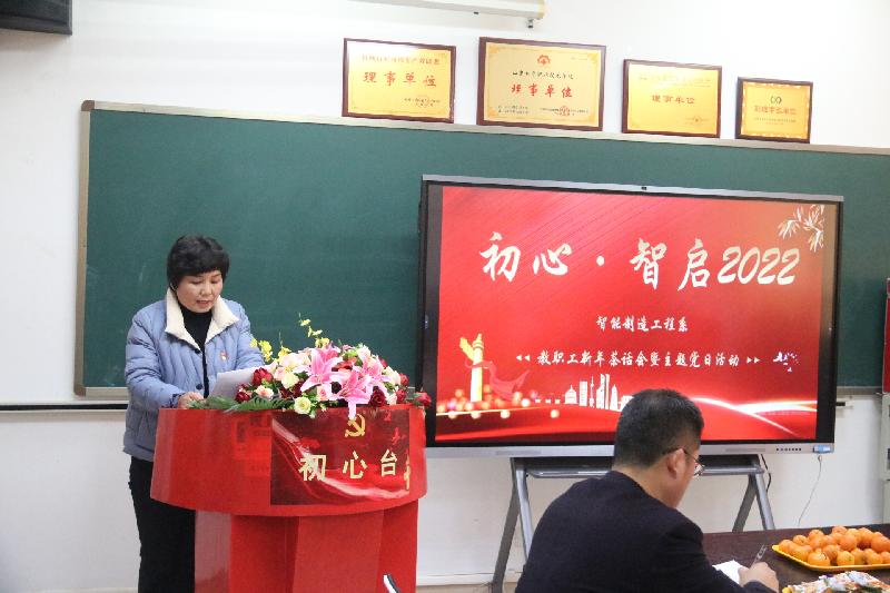 为进一步学习贯彻党的十九届六中全会精神,积极构建和谐校园文化,活跃教职工文化生活,加强团结、增进友谊、凝聚力量,12月21日下午智能制造工程系在办公图书楼201室开展“初心·智启2022”教职工新年茶话会暨主题党日活动。副院长孟翠萍出席了活动,同大家一起回望初心,迎接新的一年。活动在回顾2021年系部精彩视频中拉开帷幕,系副主任王红发表新年致辞,简要总结回顾全系一年的重点工作,提出新一年的发展思路作出展望。随后系干部和五名教师代表一一走向“初心台”,用朴实的承诺,表达自己作为一名共产党员、一名教师的初心,讲述自己平凡生涯里的使命故事,表白充满希望的2022年。孟翠萍院长在讲话中肯定了系部一年中取得的成绩,也深受老师们讲述的感动,分享了她本人从教37年的经历,回望初心,讲述其与电院同呼吸共命运的点点滴滴,活动现场洋溢着一股爱的暖流。最后全体党员齐唱《我宣誓》,表达对党的忠诚,践行初心。活动中还开展了趣味党史答题、“心有灵犀”互动小游戏等,老师们在轻松愉悦的气氛中收获知识、感恩温暖、放飞心情,携手并进,告别2021,用智慧开启2022,一同奔赴新一年的热爱。(智能制造工程系 高霞)
