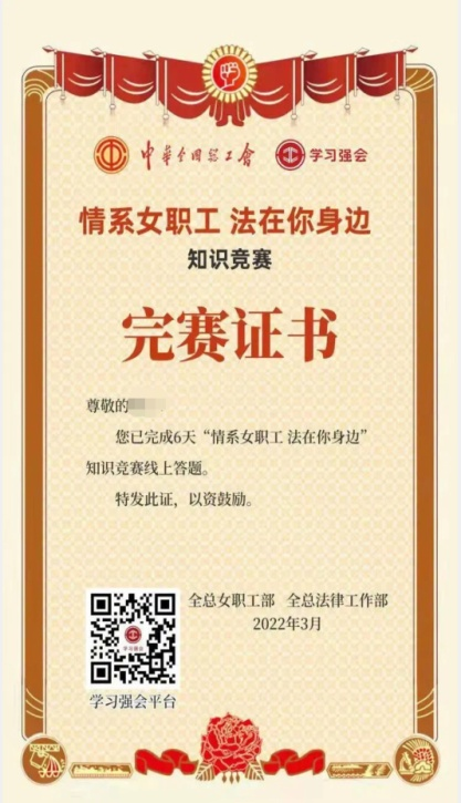 各工会大组广泛宣传,积极组织教职工参与学习竞赛活动。3月1日—3月6日活动期间,每天1次答题机会,连续6天参与答题,领取电子完赛证书。以工会大组为单位3月10日前将电子完赛证书和参赛人员汇总表报送工会邮箱gh@sdcet.cn。