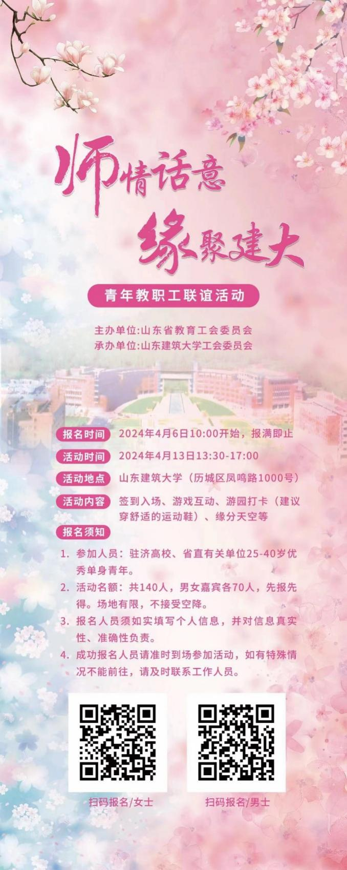 为满足广大青年教职工交友需求,搭建情感交流平台,省教育工会联合山东建筑大学工会,拟于4月13日在山东建筑大学举办单身教职工联谊活动。本次活动规模140人,男女嘉宾各70人,4月6日10:00开放线上报名,先报先得,报满即止,更多内容详见海报。本次活动面向驻济高校、省直有关单位25-40岁优秀单身青年,请各分工会组织好符合条件的教职工报名。