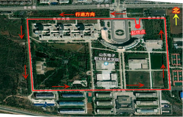 2.行走路线: 起点为诚意楼北广场东侧,沿校园外环路自西向东环行一周,终点返回至诚意楼北广场东侧。