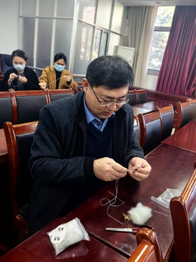 在趣味体验环节,全体会员共同参与“手工缝制饺子挂饰”活动。一个个小巧精致的饺子挂饰在教职工手中逐渐成型,既体验了传统民俗手艺,也象征团圆美满、凝心聚力的团队愿景。现场氛围轻松热烈,大家相互切磋、交流心得,在穿针引线间拉近了彼此距离,舒缓了工作压力。