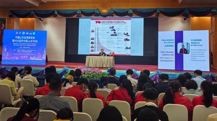 4月27日,中国山东高等教育展暨HSK留学中国(山东专场)在泰国曼谷隆重举办第三站活动。泰国前副总理、现任泰中友好协会会长功·塔帕朗西出席开幕式并致辞。