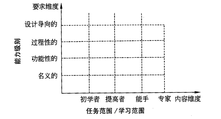 在KOMET测评技术中,能力级别的划分是保持最终测评公平公正性的基础,能力级别表现出来的标准反应在“能力值”上,能力值越大,其代表的能力水平就越高。KOMET测评技术的开发者将职业教育能力级别划分了名义能力、功能性能力、过程性能力和整体化的设计能力这四个方面,与之适配的能力阶梯则分别对应初学者、提高者、能手和专家四个层次。KOMET测评技术二维职业能力模型图如图1所示: