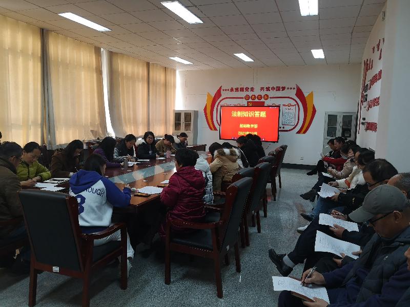 12月是第五个山东省法治宣传教育月,为积极开展国家法治宣传活动,12月14日中午基础教学部在综合楼414举办法治知识答题活动,全体教职工参加。