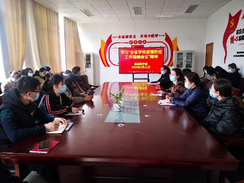 3月22日下午1:50基础教学部在综合楼414召开部门工作会议,学习贯彻“全省学校疫情防控工作视频会议”精神及学校有关疫情防控要求,全体教职工参加。