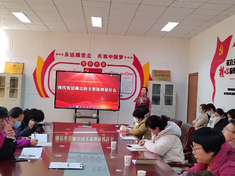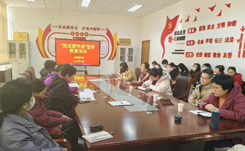 12月4日是第十个国家宪法日,12月1日至7日是2023年的“宪法宣传周”。为积极开展好国家宪法宣传活动,基础教学部开展“宪法宣传周”宣传教育系列活动,全体教职工参加。 本次活动围绕“宪法宣传周”主题:“大力弘扬宪法精神,建设社会主义法治文化”,开展宪法知识学习、宪法知识答题、宪法宣誓活动。 一、宪法知识学习 12月5日,基础教学部全体教职工齐聚综合楼414,利用学习强国平台的资源,共同学习以下十项内容:什么是宪法、宪法规行了哪些内容、什么是国家宪法日、宪法有什么作用、宪法的地位如何、宪法赋予的权利有哪些、现代宪法确立的主要原则是什么、为什么要进行宪法宣誓、宪法规定的义务、宪法的分类概述。为更好的进行自主学习,基础教学部在部门群内上传宪法相关知识和视频,教职工通过网络进行学习和收看。