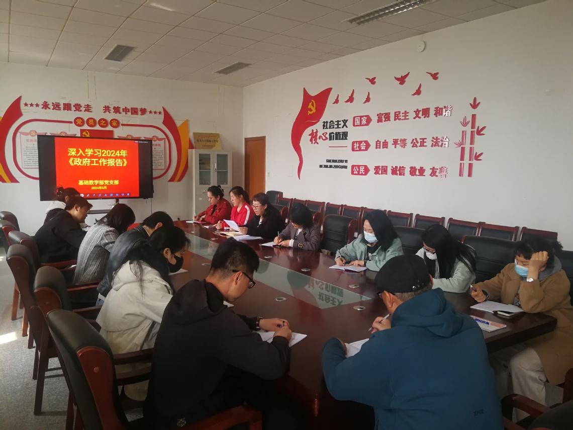 春到华夏,时盛岁新。为深入学习贯彻“两会”精神,把思想和行动统一到党和国家的决策部署上来,3月26日,基础教学部党支部开展了《2024年国务院政府工作报告》学习活动,由组织委员孙艳婷领学,全体党员参加了学习。