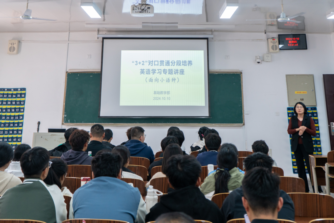 为全面提升“3+2”对口贯通分段培养学生的英语学习能力,基础教学部于10月10日针对高中小语种学习背景的学生举办了英语学习专题讲座,各二级学院学生科长或教学科长参加了讲座。此次讲座是基础教学部开展“课堂教学质量提升”系列活动之一,旨在通过定制化服务,帮助不同英语基础的学生更好地适应英语学习。