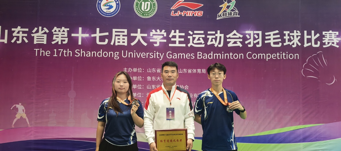 11月12日,山东省第十七届大学生运动会羽毛球比赛(乙组)成绩揭晓,我校数字商务学院学生张庆松、滕子跃基础教学部体育团队指导下,由王清华老师带队参加比赛,历经六天赛程的激烈比拼,取得混双比赛铜牌、男子单打第四的好成绩,我校代表队喜获“体育道德风尚奖”!