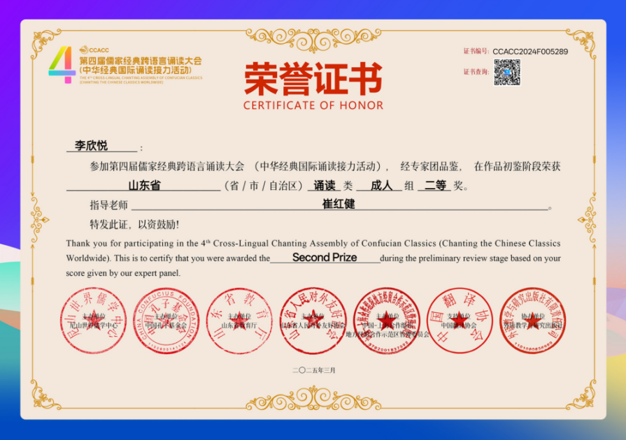 近日,由尼山世界儒学中心、中国孔子基金会、山东省教育厅等联合主办的第四届儒家经典跨语言诵读大会落下帷幕。经基础教学部选拔的作品——中英双语诵读节目《大学》在此次大会(中华经典国际诵读接力活动)中斩获山东省二等奖以及全国三等奖的优异成绩,获奖者数字财经系2024级李欣悦、孙瑷等七人同时获得主办方颁发的“儒家经典传习人”荣誉称号,为学院赢得了荣誉。