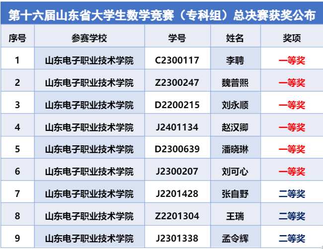 近日,第十六届山东省大学生数学竞赛(专科组)总决赛在山东职业学院圆满落幕。山东电子职业技术学院学子表现优异,在此次竞赛中斩获6个一等奖、3个二等奖,展现出了扎实的数学功底和出色的竞赛能力。获奖学生名单如下:
