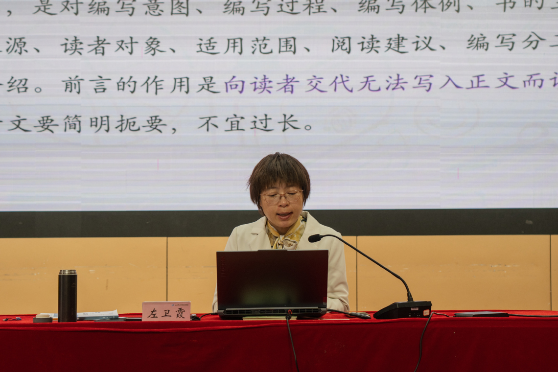 本次培训特邀清华大学出版社副编审左卫霞担任主讲。作为长期致力于职业教育教材策划与出版工作的资深专家,左卫霞编辑累计策划编辑图书300余种,其中40种教材先后入选教育部“十四五”“十三五”“十二五”职业教育国家规划教材,理论素养深厚,实践经验丰富。在讲座中,她紧扣培训主题,系统阐述了四个方面的内容:一是梳理教材编写与出版规范,详细讲解出版全流程的关键环节与注意事项;二是结合教育数字化发展新趋势,深入解读数字教材的内涵特征、核心优势与发展前景;三是对国家规划教材的评审标准、申报要求及材料准备要点进行全面解析;四是通过典型案例,分享高质量教材建设的实践路径与创新思路。