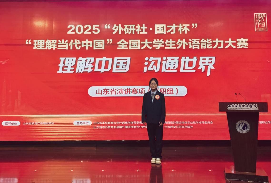 111日,2025“外研社・国才杯”“理解当代中国”全国大学生外语能力大赛山东省演讲赛项(高职组)在山东交通职业学院圆满落幕。本次比赛汇聚了来自全省79所院校的140余名选手同台竞技,竞争激烈。在我校董红、张永美老师的悉心指导下,裴晨曦、王嘉馨两位同学凭借扎实的语言功底、对大赛主题的深刻理解以及出色的现场表现,双双荣获演讲赛项银奖。