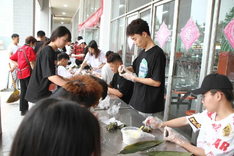 活动现场,志愿者将提前泡好的糯米、粽叶等材料整齐地摆放在桌子上,并热心为师生提供帮助,捋粽叶、做漏斗状、填糯米、压紧实、封口、扎捆,巧手翻飞,不一会儿工夫,一只只漂亮的粽子呈现在我们面前。在包粽子过程中,师生互相交流、学习包粽子的技巧。活动结束后,志愿者将包好的粽子送往餐厅加工,并告知大家于当天下午17:00前往活动现场领取蒸煮好的粽子,在一片欢声笑语中包粽子活动落下了帷幕。