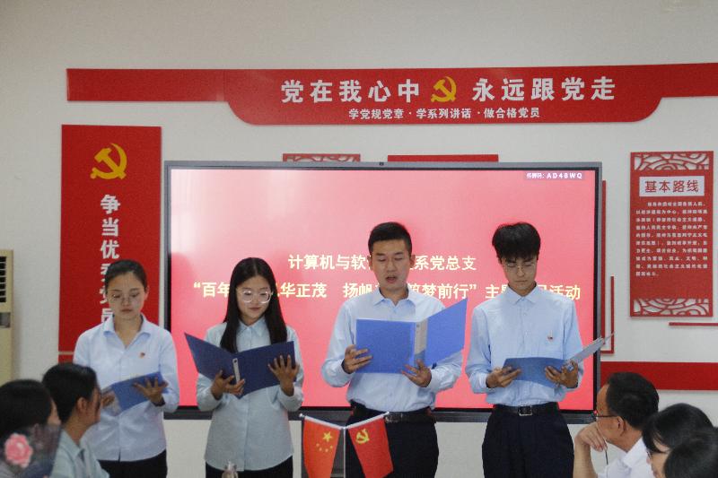随后,全体党员前往504会议室,继续开展活动。活动由系团总支书记王文静主持。会议首先由毕业生党员代表李佳洺发言,既感叹生于盛世的自豪又表明毕业后在岗位奉献价值的决心,言辞恳切,让在座的18级预备党员备受鼓舞。随后预备党员宋馨做党史学习报告,内容详实,深入人心。接下来由四位预备党员带来朗诵《不忘初心 筑梦远航》,通过声情并茂的演绎向建党百年献礼。之后,邢卫兵同志带领全体参会党员回顾习近平总书记在庆祝中国共产党成立100周年大会上的讲话,旨在贯彻落实党史学习教育,督促18级预备党员爱国爱党,肩负青年担当。最后全体党员教师鼓掌欢送18级预备党员,此次党日活动在党员教师寄予厚望的掌声中正式结束。