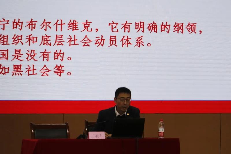 王毅东书记以“坚持党的基本理论,继承和发展马克思主义”为核心展开讲解,着重强调科学发展,详细阐述了“中国共产党的指导思想确立和发展的历史坐标”,提出并解释了中国共产党把马列主义确立为指导思想的原因,点明马克思列宁主义是行动的指南而不是教条,着重强调了科学发展观和习近平新时代中国特色社会主义思想。
