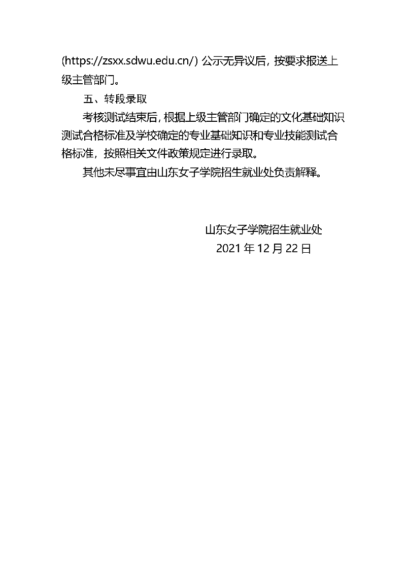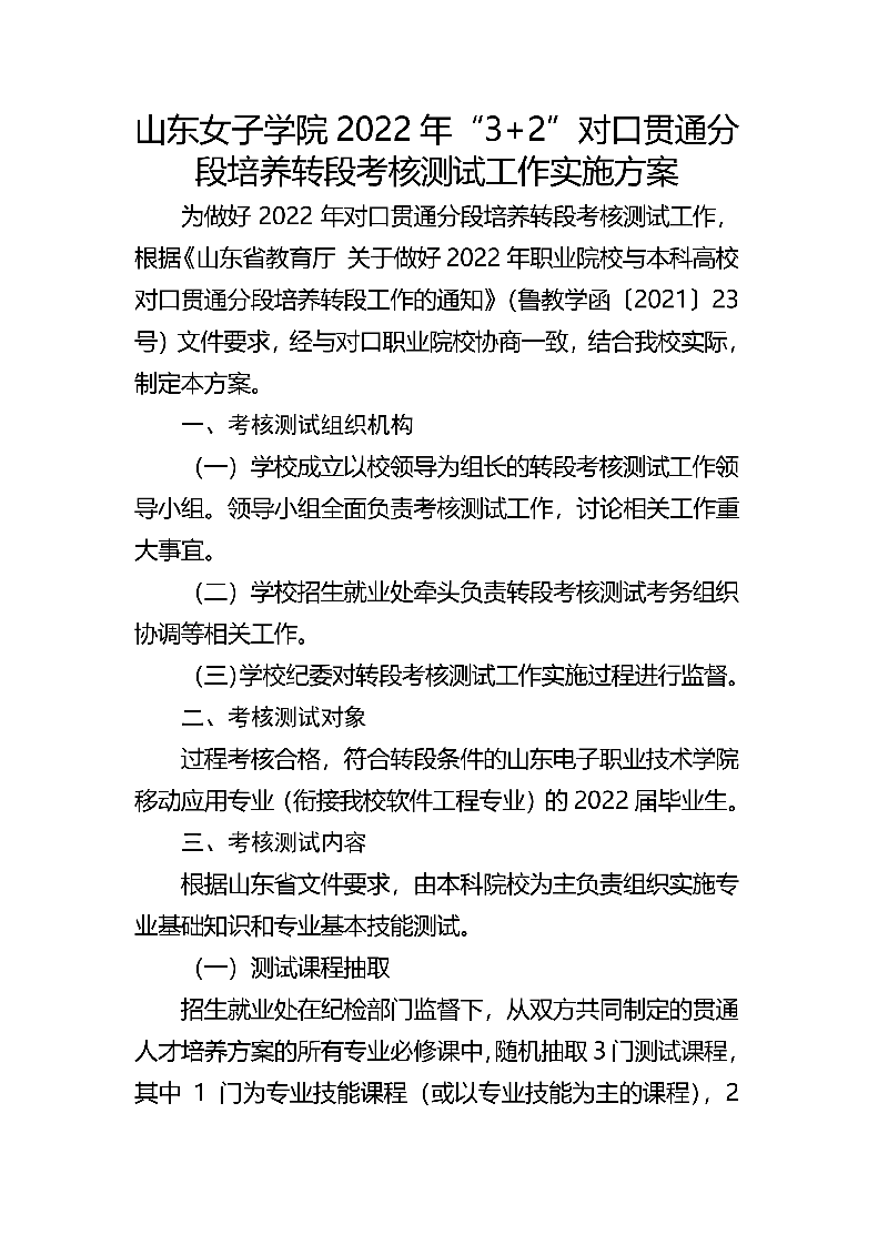 山东女子学院2022年“3+2”对口贯通分段培养转段考核测试工作实施方案