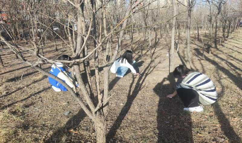 在李海彬老师带领下,志愿者们在学校树林清理垃圾、打扫校园警卫室。活动的最后,同学们在横幅上签名留念。