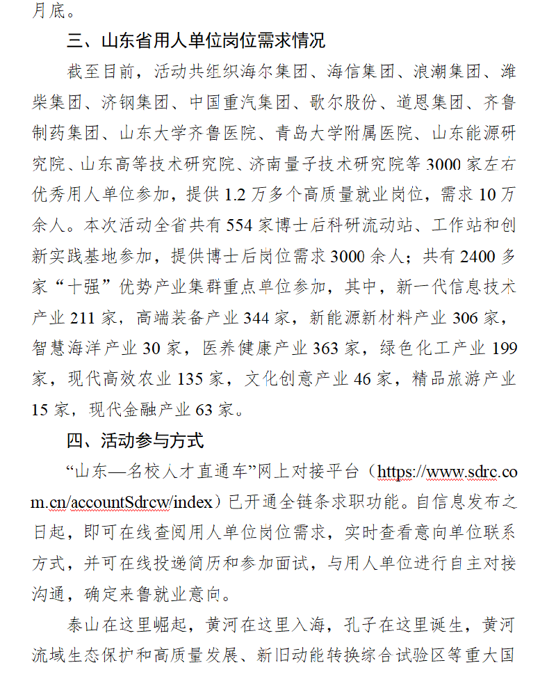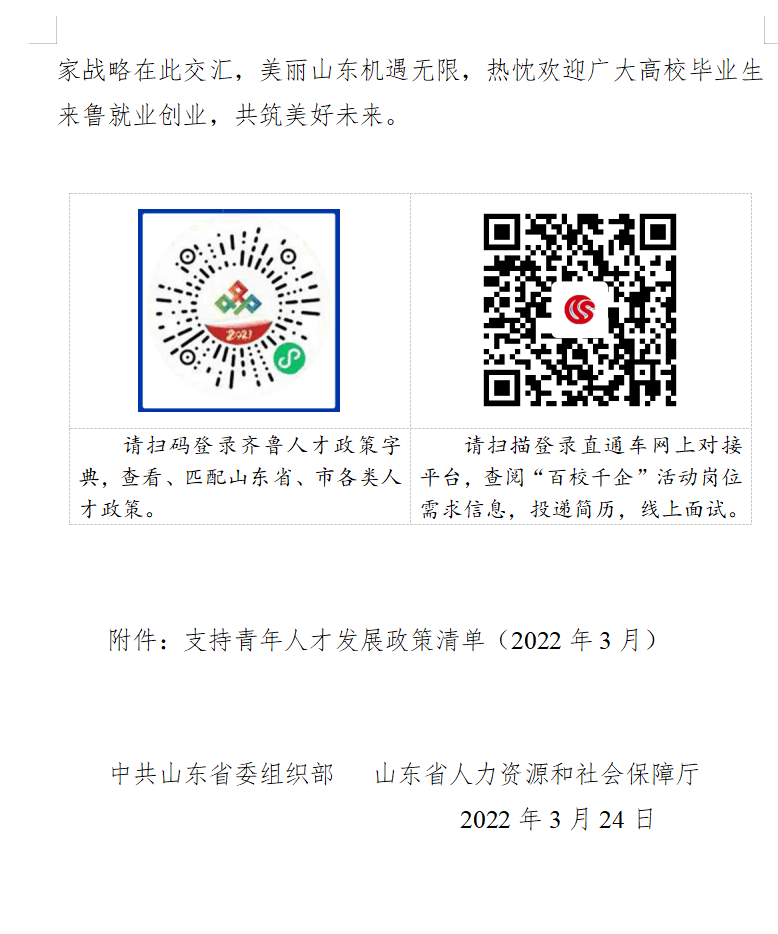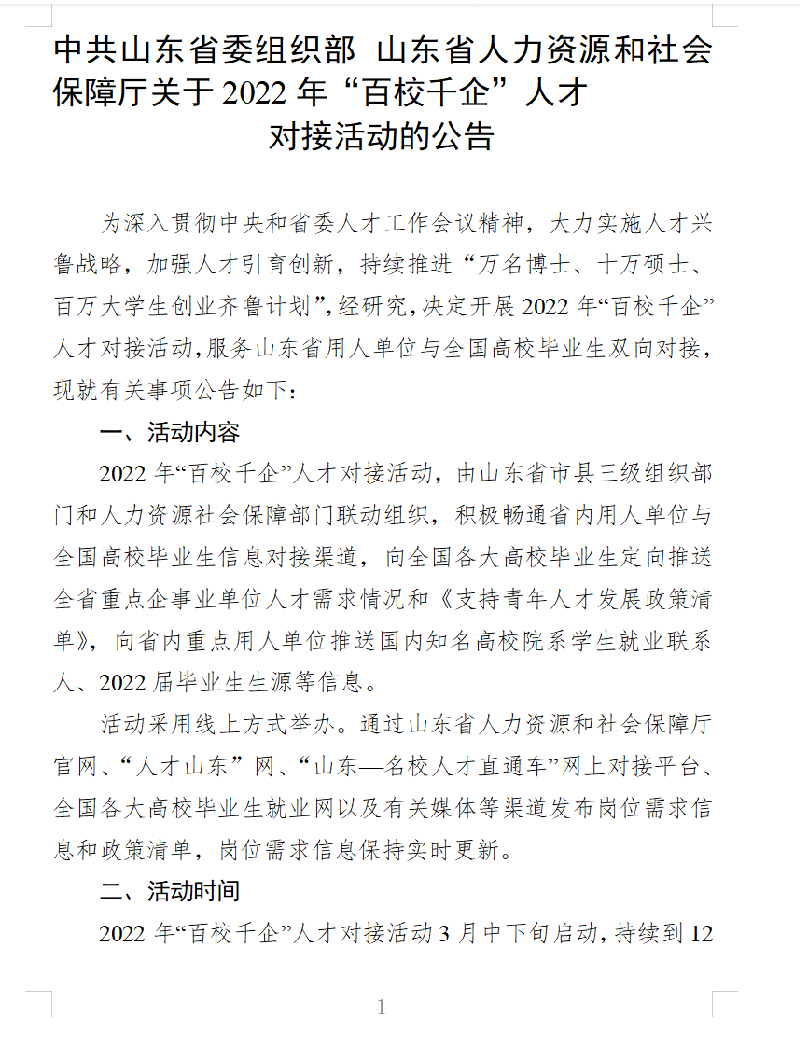 附件:中共山东省委组织部 山东省人力资源和社会保障厅关于2022年“百校千企”人才对接活动的公告