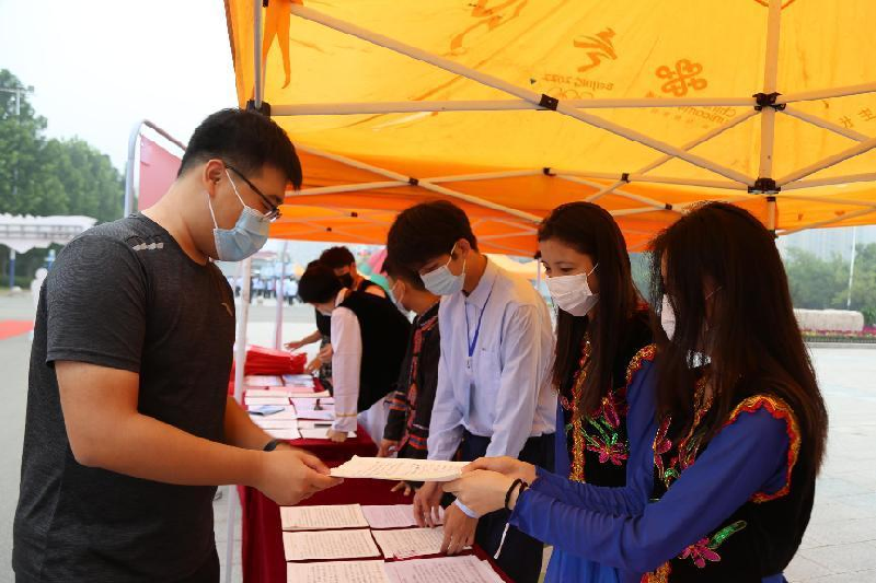 “我站在草原望北京,一望无际国泰安宁……”民族之家的同学们身着民族服饰在迎新现场载歌载舞,用他们独特的方式迎接各民族新生的到来,铸牢中华民族共同体意识。“专属礼包”将我系用“心”迎新的理念体现到了极致:“喜迎二十大 e路心向党”思政育人手册、入学温馨提示、防疫物品以及“写给三年后的自己”慢递信主题活动信封等,让新生在细节中受教育、感温情。“志愿红”也成为了迎新现场一道亮丽的风景。党员及入党积极分子等都积极投身到迎新志愿服务工作中,他们主动承担起疫情防控、现场引导、行李搬运等工作,用实际行动践行初心和使命。