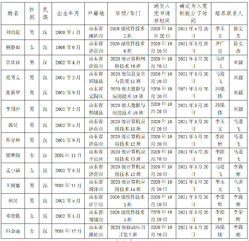 经支部委员会研究,报上级党委备案同意,将苑博文等14 名同志列为发展对象。根据发展党员工作有关要求,现将其有关情况公示如下,详细信息见附件。
