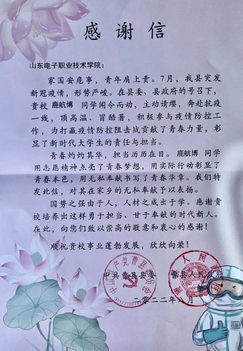 纪梦瑶、陈磊、鹿航博三位同学出色的志愿服务工作,得到了曹县人民政府的认可和感谢。他们在给山东电子职业技术学院的感谢信中写道:“国势之强由于人,人材之成出于学。感谢贵校培养出这样勇于担当、甘于奉献的时代新人。在此,向您们致以崇高的敬意和衷心的感谢!顺祝贵校事业蓬勃发展,欣欣向荣!”