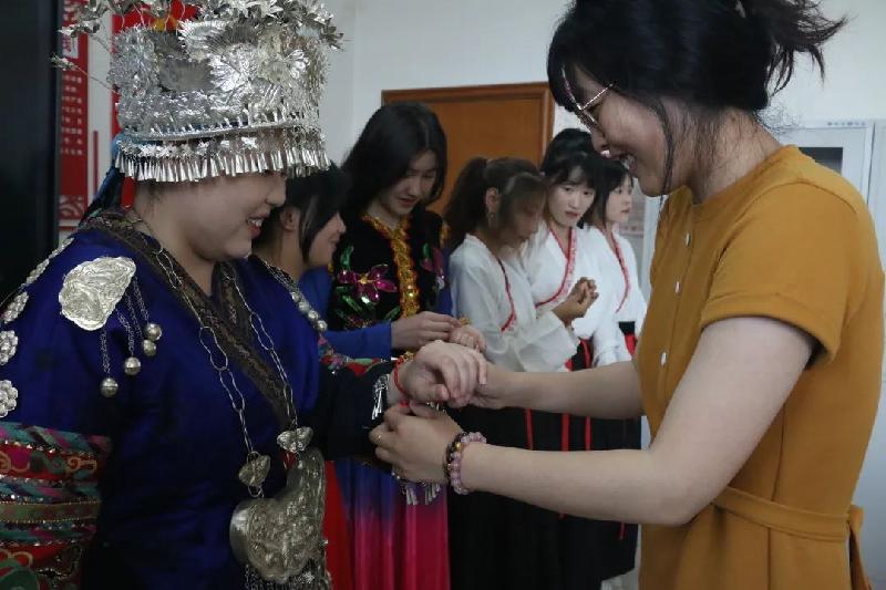 红色宣讲团的成员们诵读《论语》,让大家在端午佳节感受中国优秀传统文化的魅力。五彩丝线,祈福纳吉。老师们将蕴含美好祝愿的五彩绳分别佩戴在同学们的手上,他们身着特色民族服饰,手戴五彩绳在活动现场翩翩起舞,一首《红昭愿》,表达了欢度佳节的喜悦之情。舞蹈过后,少数民族学生身着各族特色民族服装,带来服装走秀将活动推向了高潮。王文静为在场师生送上端午祝福后,发放了制作端午香囊的材料,让大家亲手制作端午香囊,共同感受传统节日的魅力。