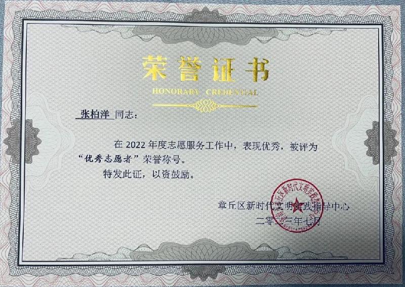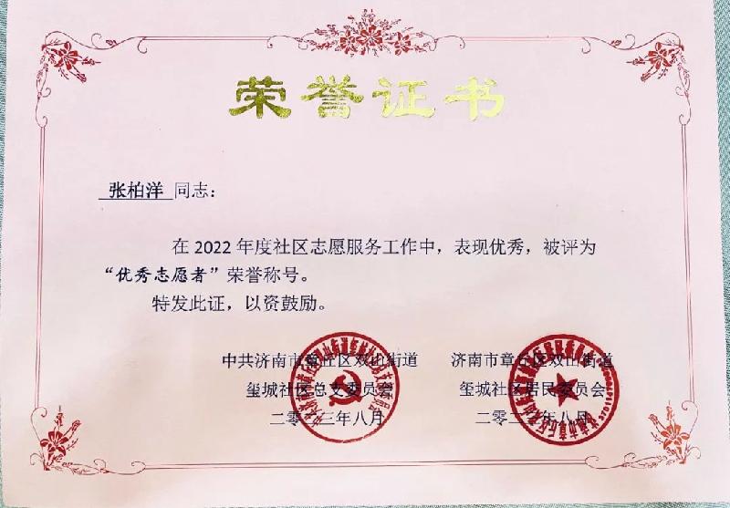 近日,济南市章丘区融媒体中心、章丘区新时代文明实践指导中心、双山街道玺城社区总支委员会、玺城社区居民委员会授予张柏杨同学2022-2023年度“优秀志愿者”荣誉称号,该项荣誉充分肯定了我系青年学子的在志愿服务工作中的肯定。