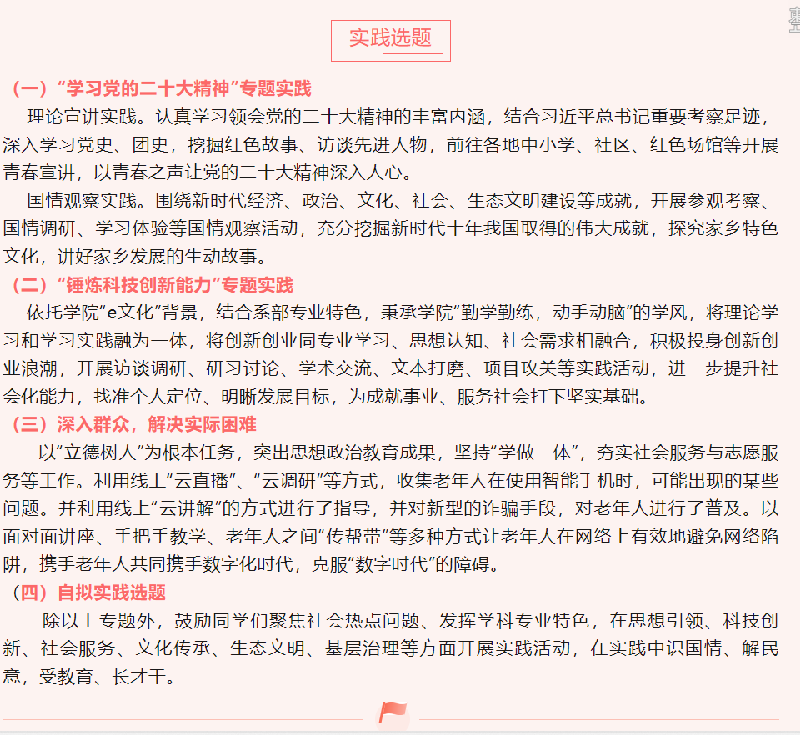 我系积极鼓励全体同学在保障自身安全健康的情况下,以个人或团队形式积极开展社会实践活动,在实践中坚定理想信念、厚植家国情怀、强化社会担当、 拓展国际视野,争做有信仰、讲政治、重品德、守纪律、肯奉献、争先锋的新时代青年。