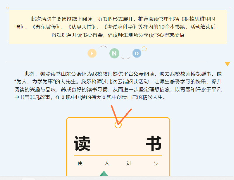 为全面贯彻落实党的二十大精神和习近平总书记系列重要讲话精神,进一步推进全民阅读和建设书香校园,引导广大师生“多读书、读好书、善读书”,培养学生核心素养,营造“书香定襄”的良好文化氛围,我系联合“樊登读书山东分会”共同开展以“e起阅读”为主题的线上阅读活动。