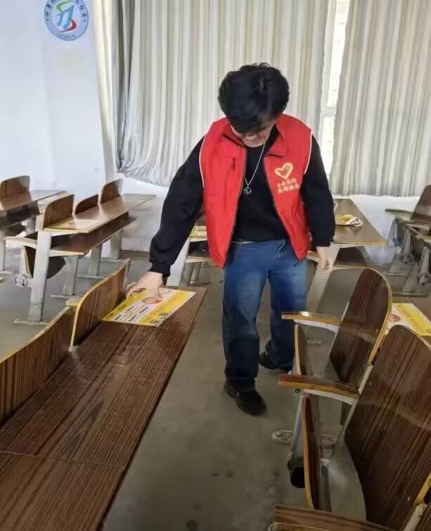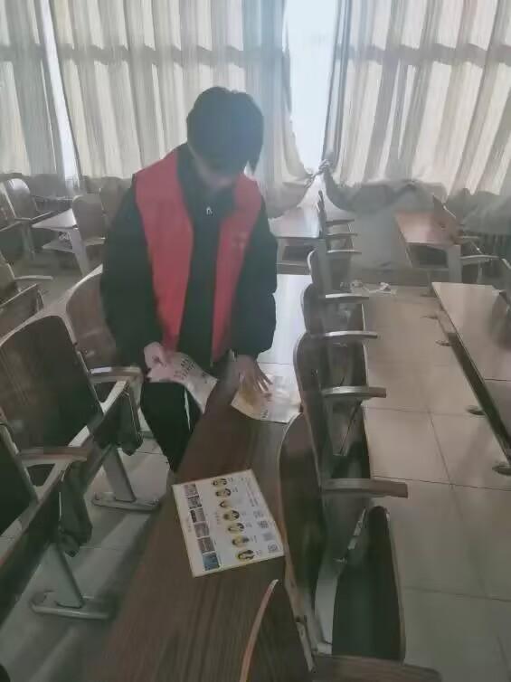 我系组织同学开展校园卫生志愿者,分组清理教室内的小广告,发扬志愿者精神,共创美好校园环境。