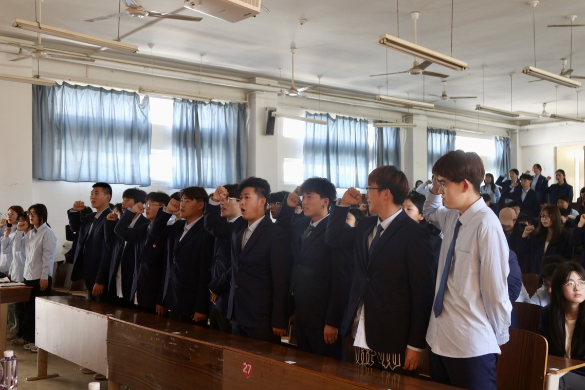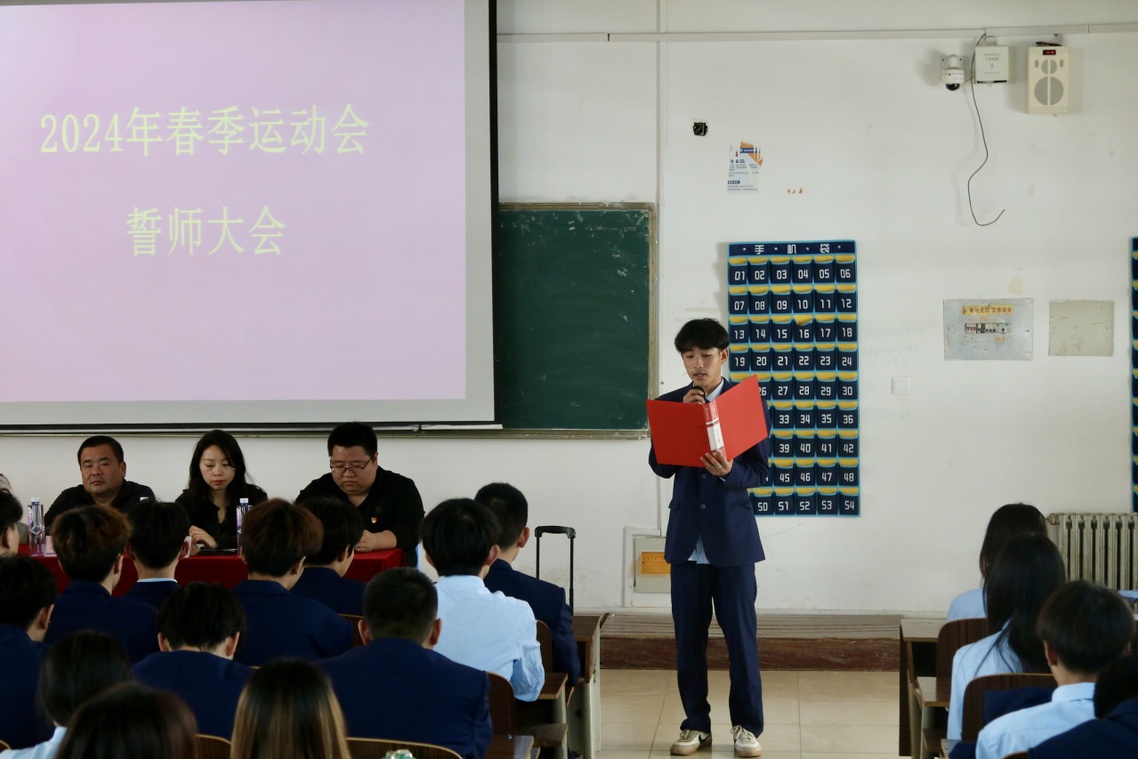 为激发运动员的信心和斗志,增强团队凝聚力,提高运动员的责任感,4月18日,我系在阶梯二开展2024年春季运动会运动员誓师大会,本次大会由冯铭伟老师主持,系团总支书记王文静、全体辅导员和运动员参加。
