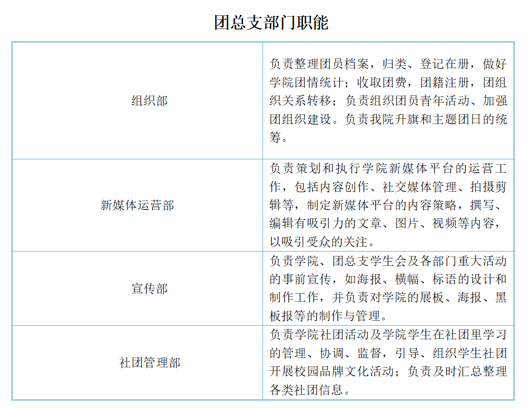 大数据与人工智能学院团总支是在院党委和校团委领导下的青年团总支部委员会的简称。目前团总支委员会共有新媒体运营部、组织部、宣传部、社团管理部,4个职能部门,各部门各司其职,恪尽职守。