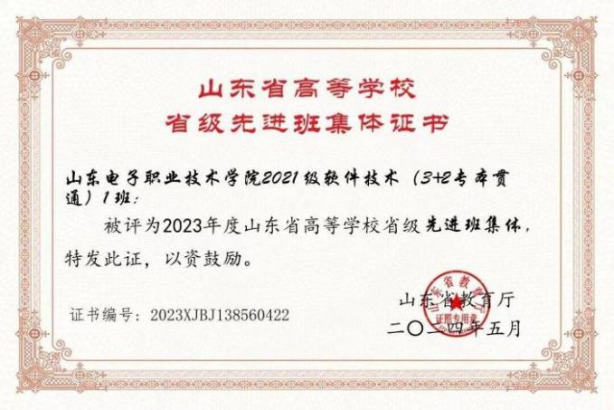 2021级软件技术(3+2专本贯通)1班被评为山东省高等学校省级先进班集体