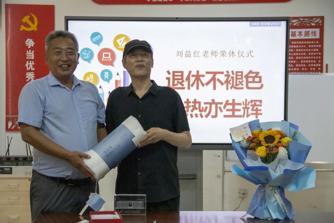 在这个愉悦且不舍的氛围中,刘学为刘益红送上了纪念品并给予了衷心的祝福,对刘益红高尚师德、精湛业务、榜样示范等方面进行了充分的肯定和高度的赞扬。