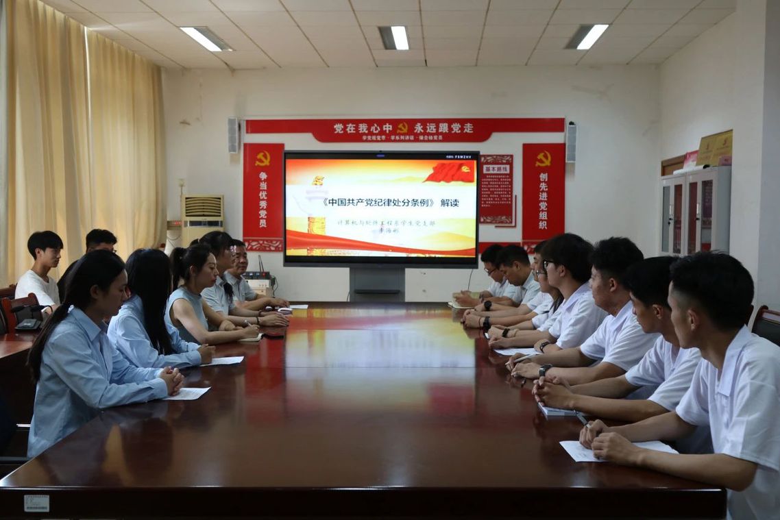 为强化党的纪律性,维护党的团结统一。6月29日,计算机与软件工程系学生党支部书记李海彬在综合楼504组织召开《中国共产党纪律处分条例》党课。学生党支部全体党员及入党积极分子参加学习。