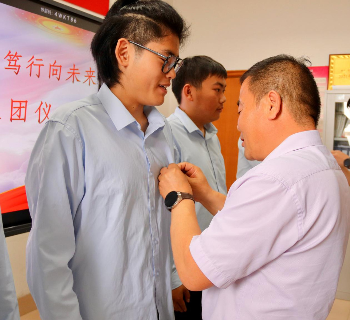 在庄重的氛围中,孟旭超带领全体新团员面向团旗庄严宣誓,铿锵有力的誓言回荡在会场,表达了新团员们对共青团组织的无限忠诚和对共产主义事业的坚定信念。新团员们整齐肃立,右拳紧握,声音洪亮地跟读入团誓词:“我志愿加入中国共产主义青年团,坚决拥护中国共产党的领导,遵守团的章程,执行团的决议,履行团员义务,严守团的纪律,勤奋学习,积极工作,吃苦在前,享受在后,为共产主义事业而奋斗!”