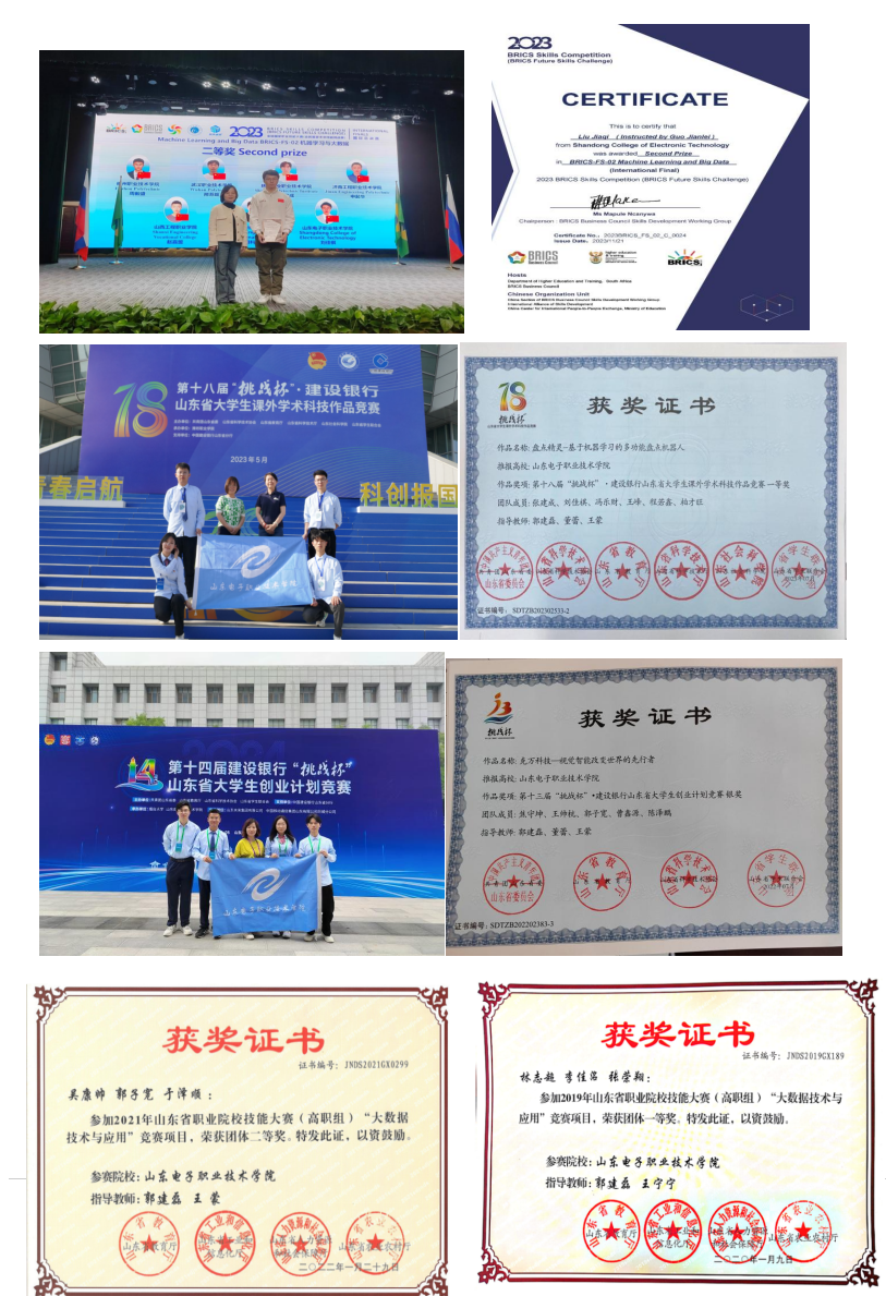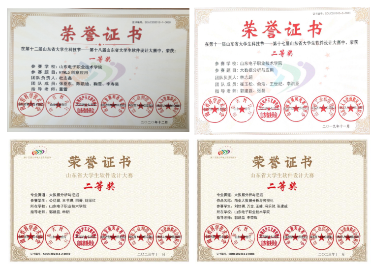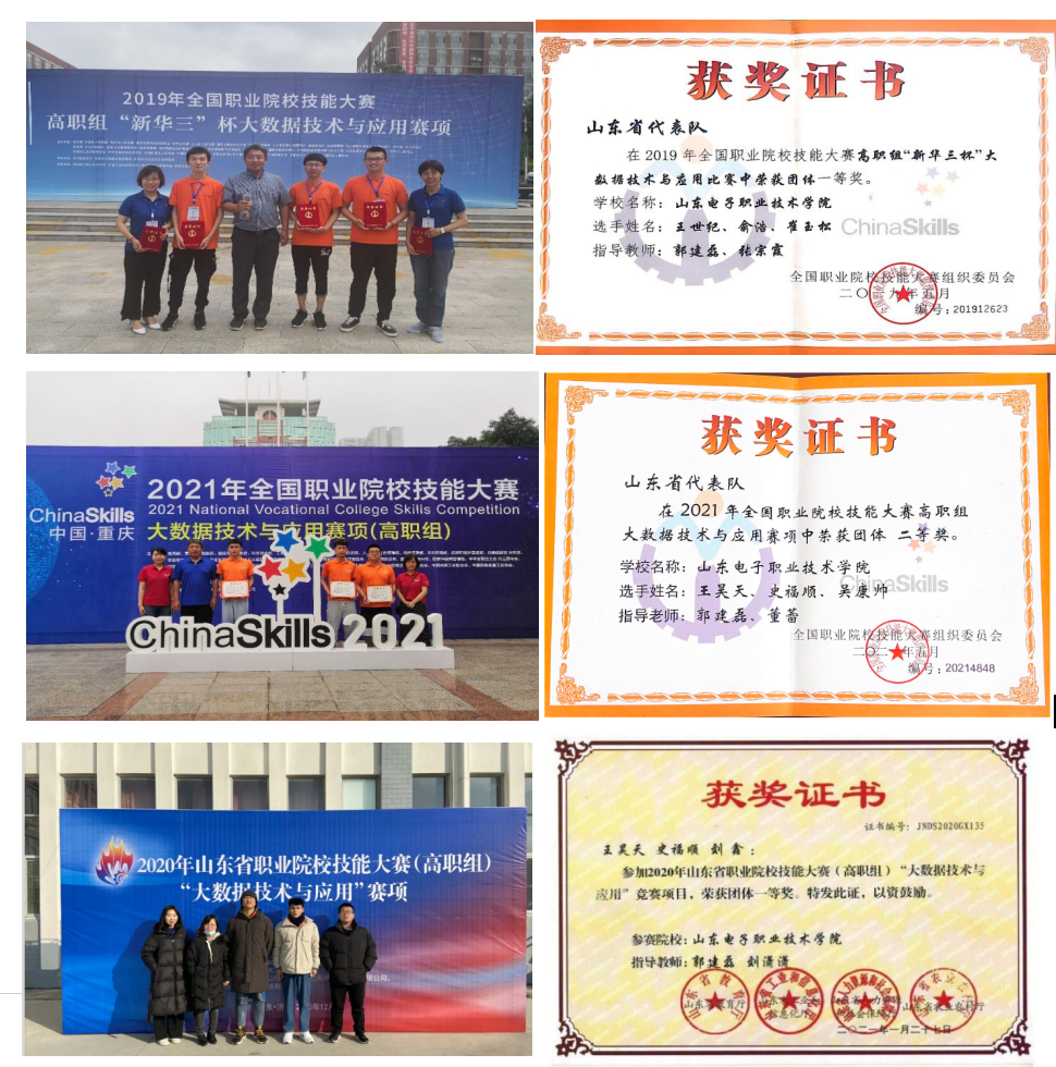 大数据技术专业致力于创新型大数据人才的培养,不断提高人才培养质量,取得了丰硕的育人成果。学生在国家级、省级大数据技能竞赛中屡获佳绩。荣获全国职业院校技能大赛“大数据技术与应用”赛项一等奖1项,国赛二等奖2项,省赛一等奖2项,二等奖1项,近三年来在省级以上各类大数据竞赛中获奖20多项。部分荣誉证书如下:(大数据与人工智能学院 图文:大数据与人工智能学院)