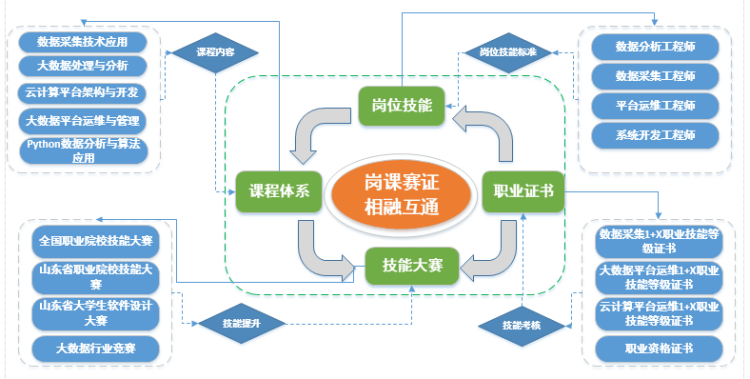 以大数据行业企业工作任务和职业能力为依据,以大数据技术专业群为支撑,科学合理构建了大数据技术专业课程体系,主干课程包括:Python程序设计、MySQL数据库应用技术、Linux操作系统、Web前端基础、大数据平台部署与运维、数据采集技术、数据仓库技术应用、大数据处理与分析、数据可视化技术及应用、NoSQL数据库技术应用、Python数据分析与算法应用等“岗课赛证”融通课程。专业课程体系完备、实训设施先进,主干课程内容与对应的1+X职业技能等级标准有机融合。