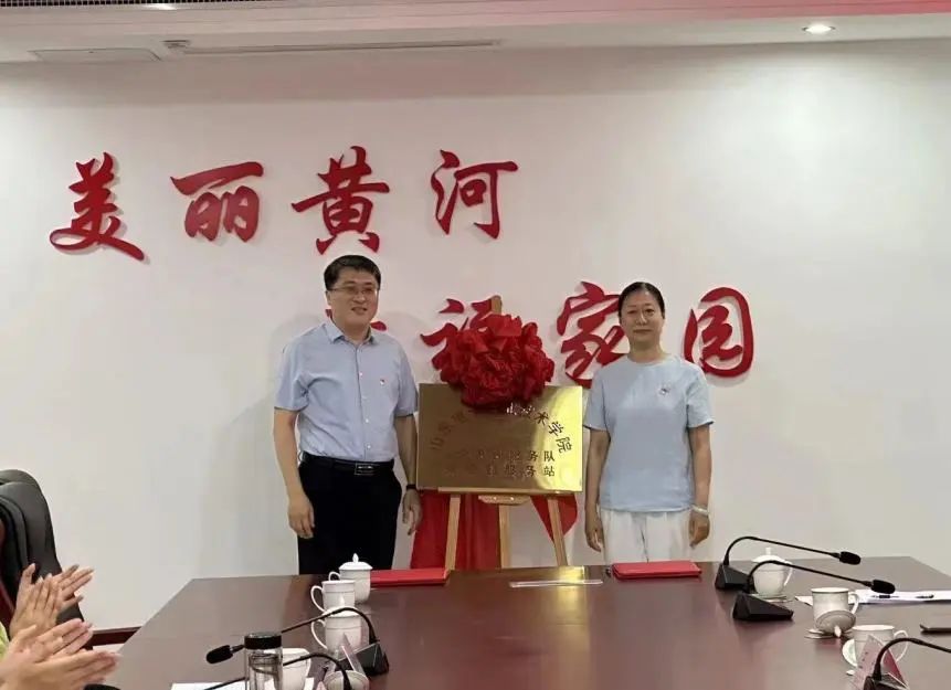 聂莺与李建春共同为山东电子职业技术学院“e念思计”服务队双报到服务站揭牌。