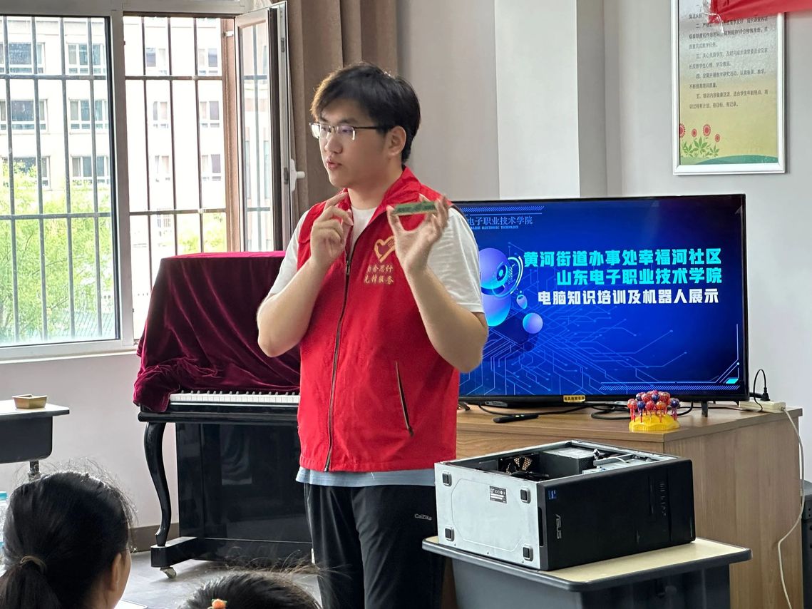 在绿树成荫的黄河街道,队员利用投影和实物展示,从基础的电脑硬件构造到操作系统的应用,再到互联网安全与网络安全防护,每一步都讲解得详细而生动。直观地让小朋友们感受到电脑内部世界的奥秘,以及它如何成为我们日常生活和工作中不可或缺的工具。鼓励小朋友亲自动手操作电脑,体验文字处理、图片编辑等基础功能。在队员的耐心指导下,小朋友第一次感受到了科技带来的便捷与乐趣,脸上洋溢着满足与喜悦的笑容。
