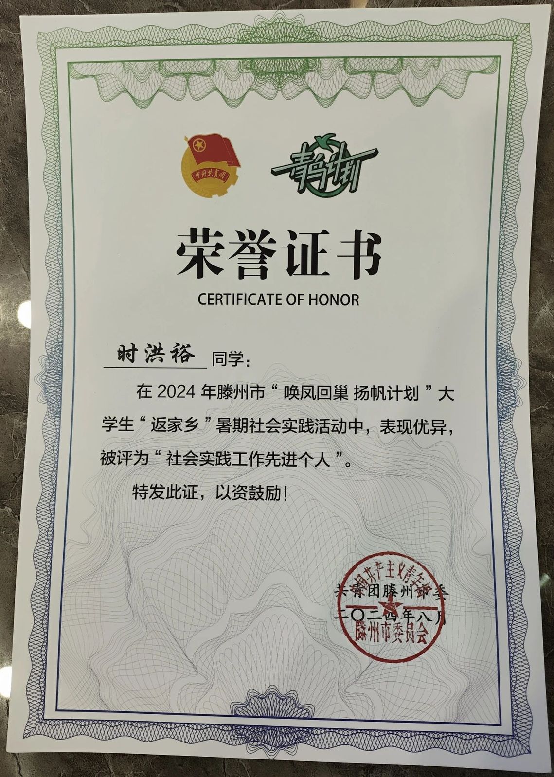 暑期“青鸟计划”社会实践活动对于推动青年人才成长,增强大学生对家乡的认同感和归属感意义重大,我系学子时洪裕暑假期间,积极响应学校号召,参加滕州市“唤凤回巢 扬帆计划”大学生“返家乡”暑期社会实践活动。过程中,时洪裕深刻学习贯彻习近平新时代中国特色社会主义思想,甘于奉献,脚踏实地,展现了新时代下新青年的责任与担当。