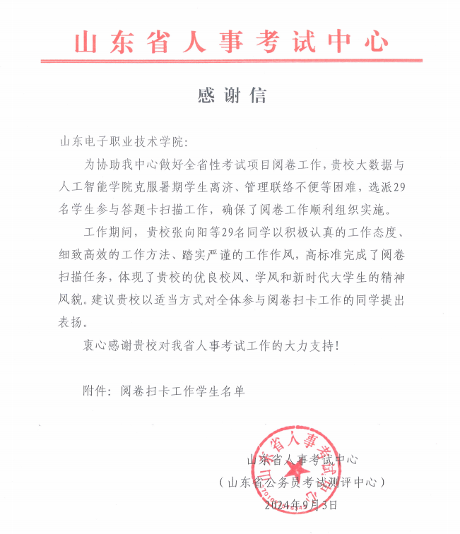 近日,我校收到一封来自山东省人事考试中心的感谢信。信中对我院29名同学在全省性考试项目阅卷工作中的优异表现给予高度肯定和赞扬,同时也表达了对学校的感谢之情。