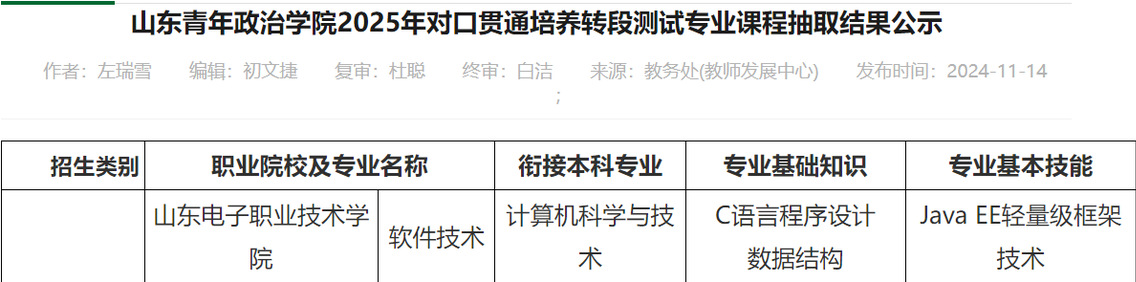 山东电子职业技术学院计算机与软件工程系2025年对口贯通培养转段测试专业课程抽取结果公示。