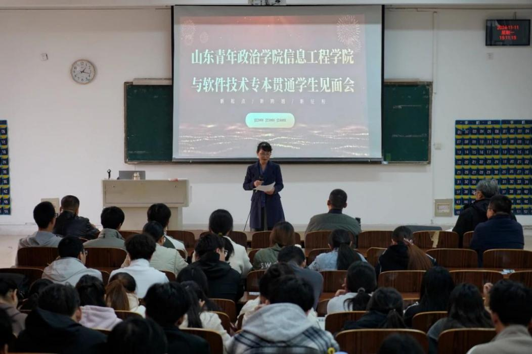 11月11日,为深化与本科院校的交流合作,提升学生对专本贯通政策的认知,帮助学生明确方向,大数据与人工智能学院举办了一场见面会。此次见面会邀请了山东青年政治学院教务处实践科科长葛伟、信息工程学院副院长冯素珍和计算机科学与技术专业教研室主任李保田,为学院22、23、24级软件技术专本贯通班学生进行讲解。