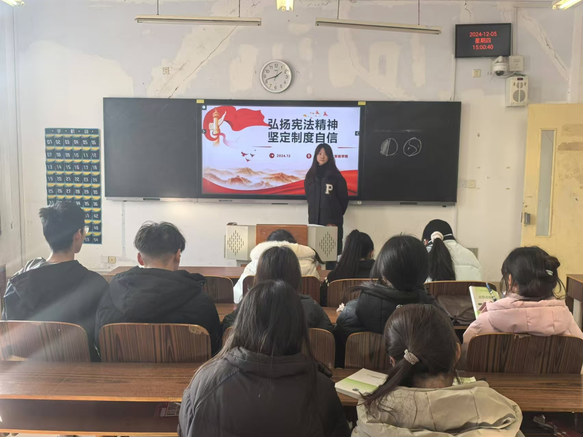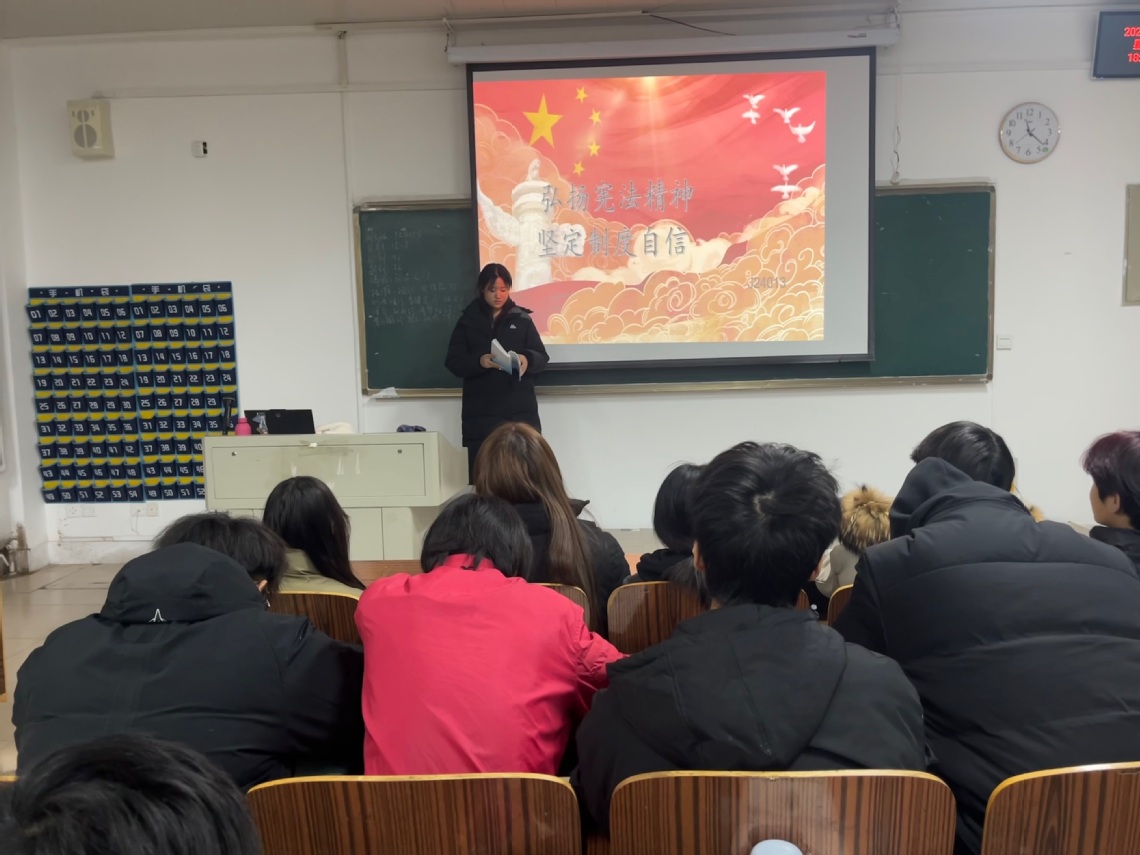 活动伊始,各团支部采用PPT宣讲和观看宪法视频相结合的方式,引导同学们系统学习宪法知识。在PPT宣讲中,团支书们详细讲解了宪法的发展历程,从新中国第一部宪法的诞生,到历经多次修订后的不断完善,让同学们深刻感受到宪法与时俱进的品质。同时,对宪法核心内容的解读,使同学们明确了公民的基本权利与义务,以及国家机构的组织和运行原则等重要知识。而通过观看宪法视频,同学们更加直观地认识到宪法在国家治理和社会生活中的重要作用。过程中,同学们认真聆听、积极思考,深刻领悟宪法精神,并纷纷表示将法治观念融入日常生活。随后,全体学生庄严宣誓,承诺今后将始终以宪法为言行标尺,严格要求自己,主动捍卫宪法权威,以实际行动践行对宪法的尊重和维护。