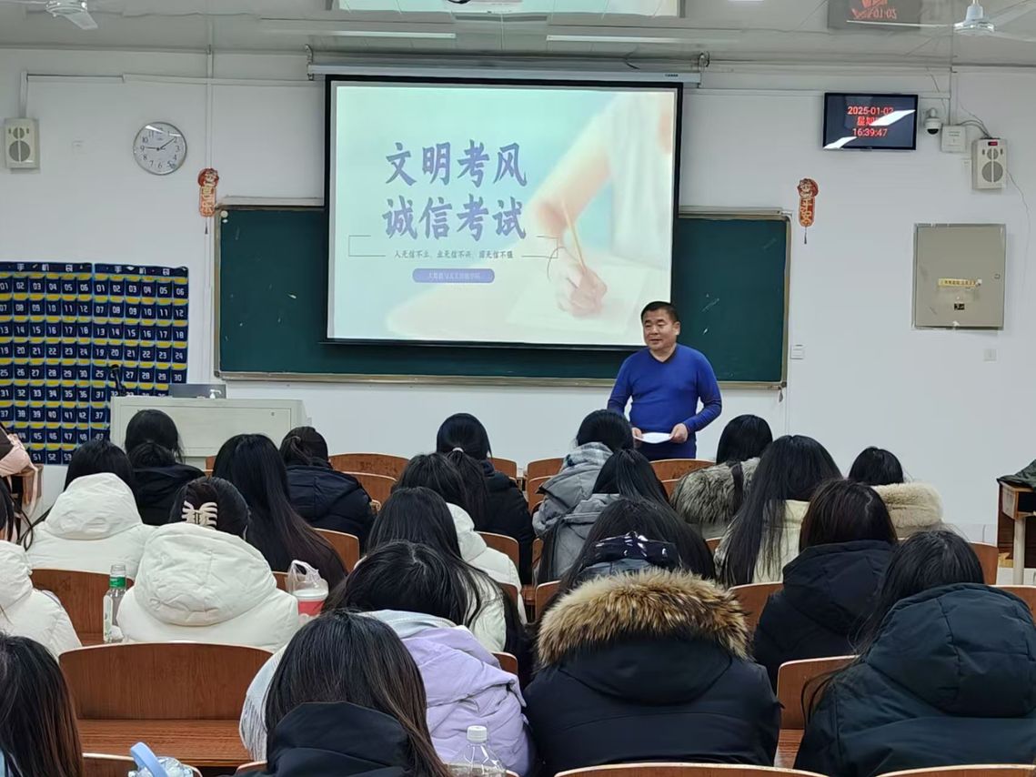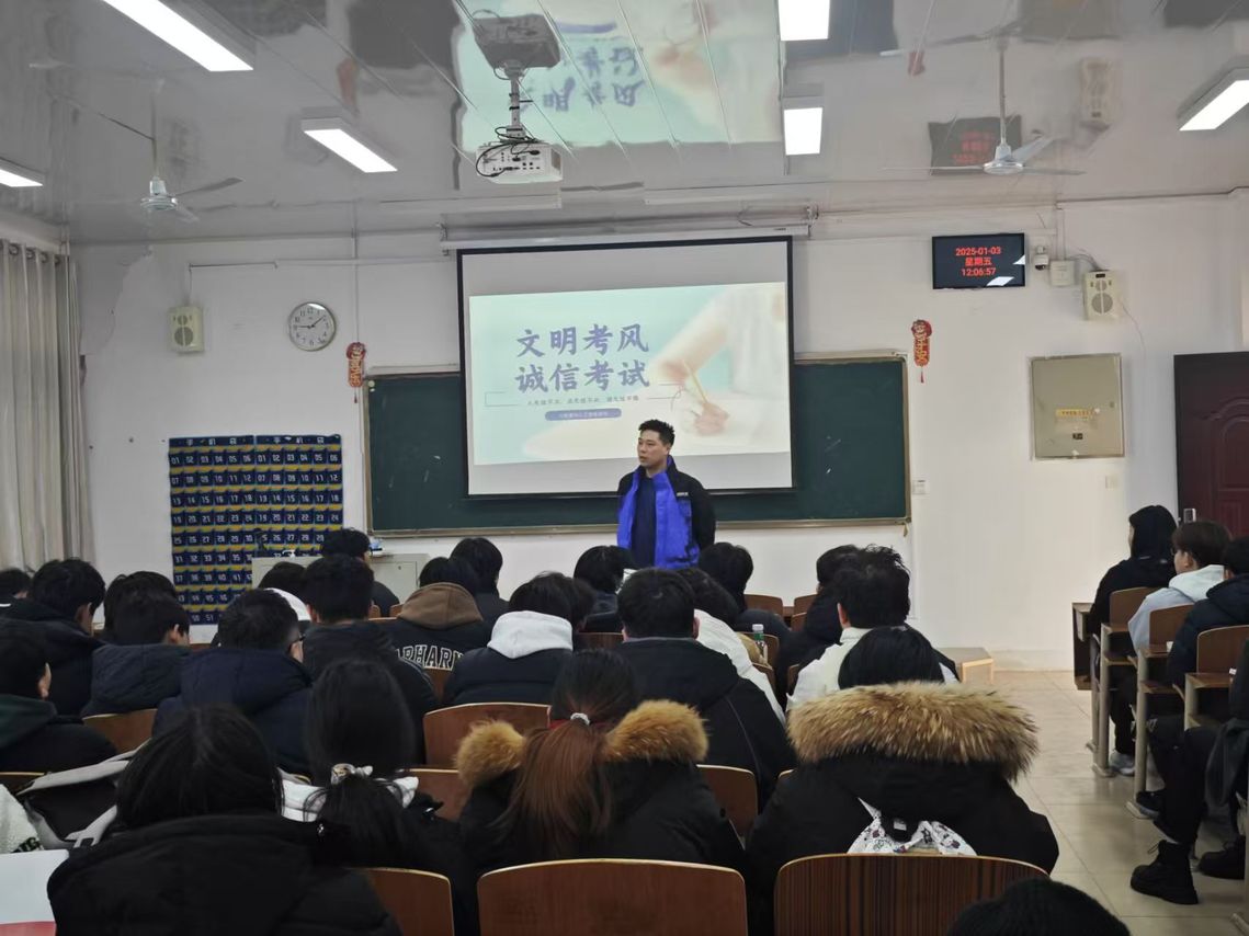 班会上,辅导员首先从备考心态与节奏方面给予学生悉心指导,强调要调整心态,保持规律作息,合理把握复习节奏,为考试做好充分准备。紧接着,严肃说明了学校考风考纪,要求同学们务必严格遵守考试规定,端正考试态度,认真备考,诚信完成所有科目的作答。辅导员着重强调,诚信考试至关重要,对于任何考试作弊行为,学校都将依据规章制度,采取严厉的处罚措施。