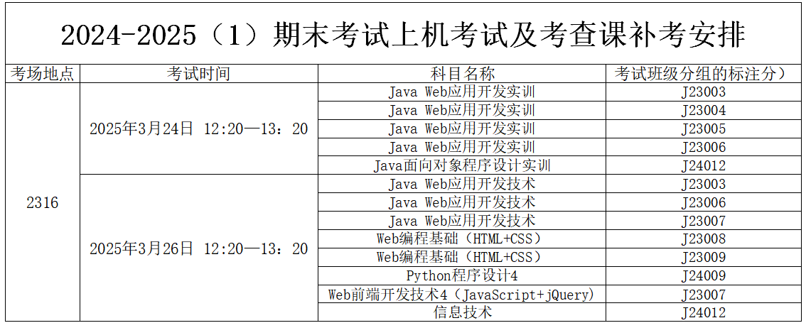 根据学校教务处关于2024-2025学年第一学期期末考试补考工作的相关安排,为确保我院补考工作顺利开展,现将2024-2025学年第一学期期末补考(专业课)具体安排进行公布: