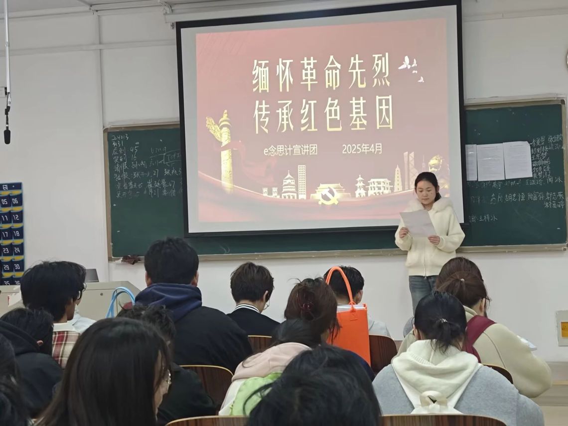 为缅怀革命先烈,传承红色基因,4月2日至4日,”e 念思计“宣讲团深入各班级,开启“缅怀革命先烈,传承红色基因”宣讲之旅。宣讲员刘心如等人满怀深情,将革命先烈的英勇过往与崇高精神娓娓道来,内容涉及先烈们的艰辛奋斗、无畏牺牲,以及为推动社会进步立下的丰功伟绩。宣讲团巧用专业知识,创新宣讲形式,既寄托对先烈的哀思,又锤炼自身专业本领,强化社会担当。未来,我院宣讲团一定讲好红色故事,引领学生筑牢理想信念根基,厚植爱国情怀,培育民族复兴栋梁。